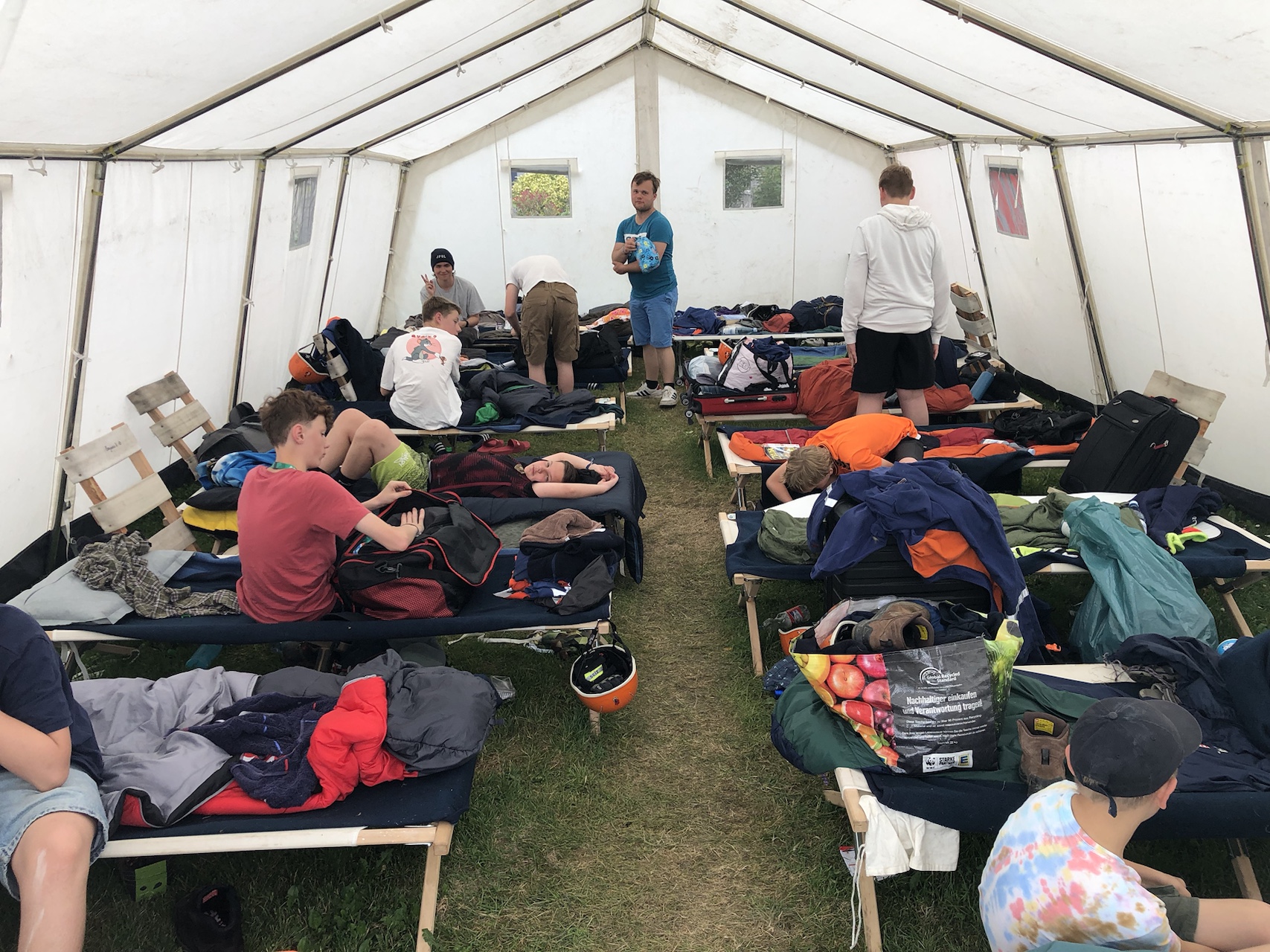 Gemeinsam mit der ganzen Jugendfeuerwehr verbringst du eine unvergessliche Woche in großen Gemeinschaftszelten – natürlich nicht auf dem Boden, sondern gemütlich auf Feldbetten.