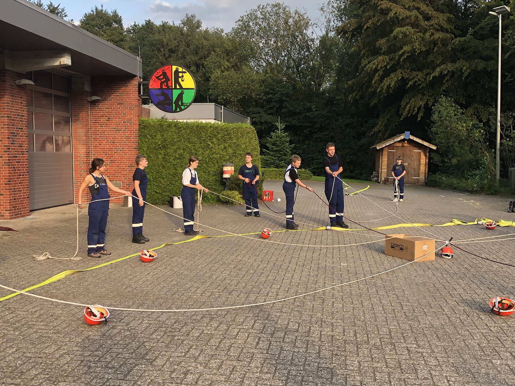 Du darfst technische Geräte ausprobieren und lernst, wie man richtig mit ihnen umgeht. Auch der Umgang mit Leitern, das Binden von Knoten und der Gebrauch von Feuerwehrschläuchen stehen auf dem Programm.