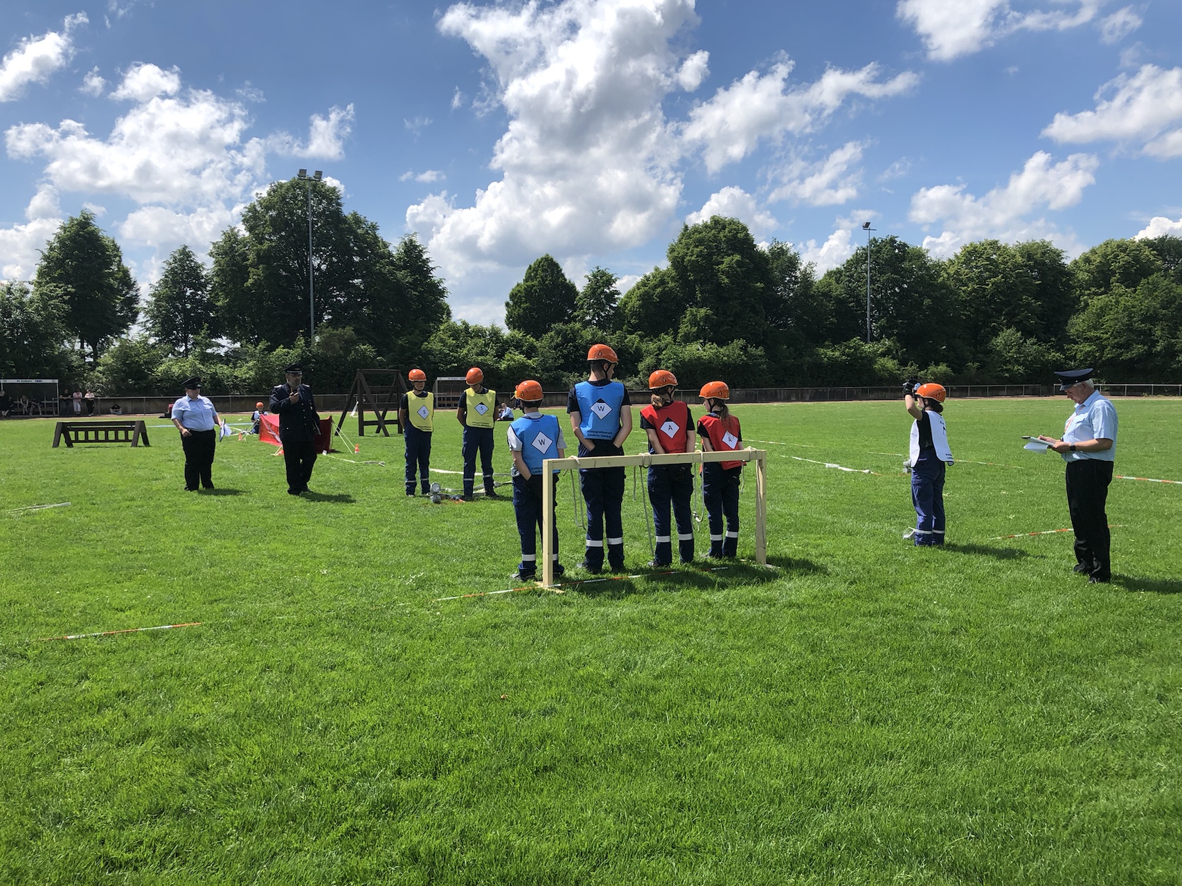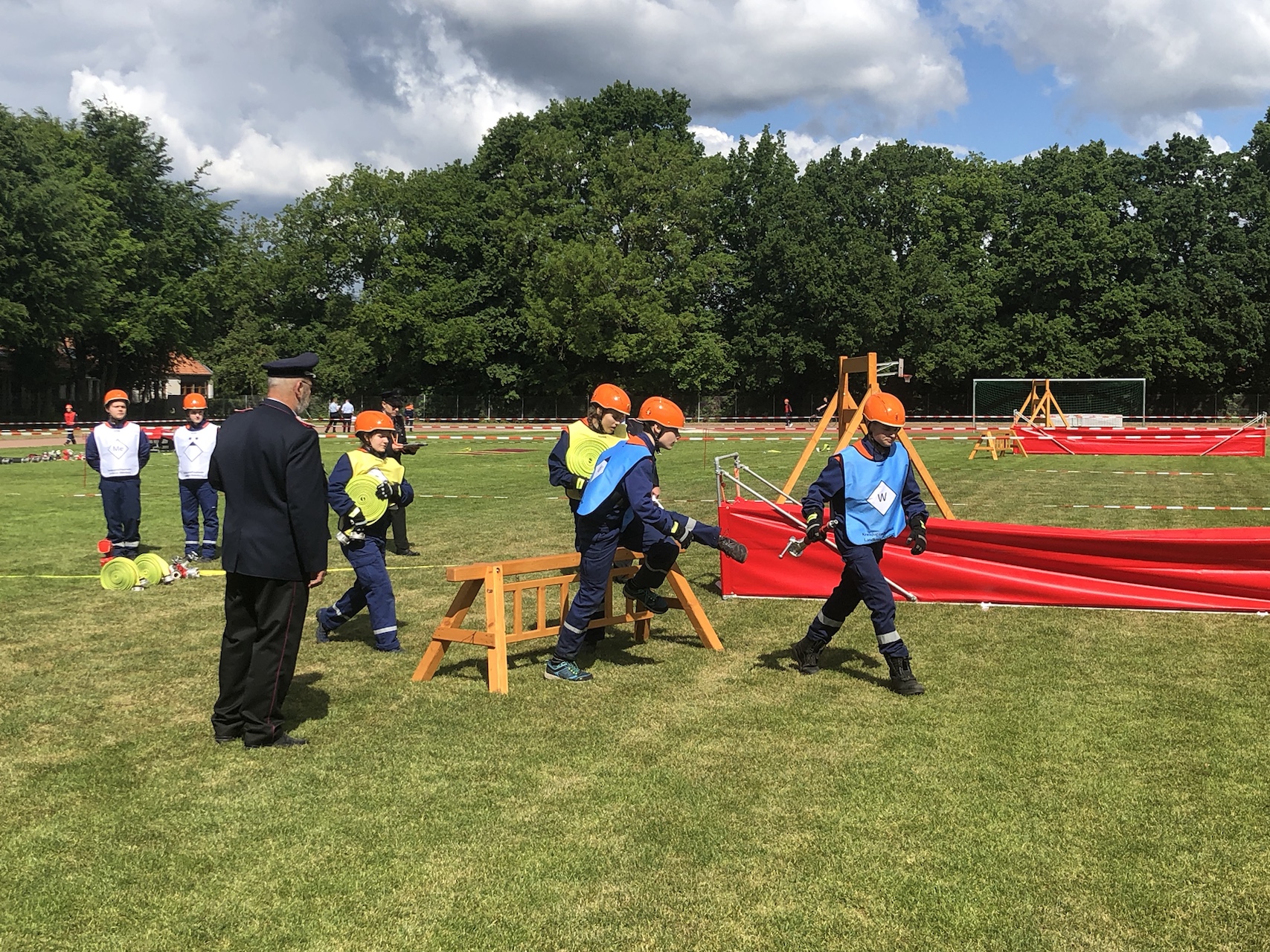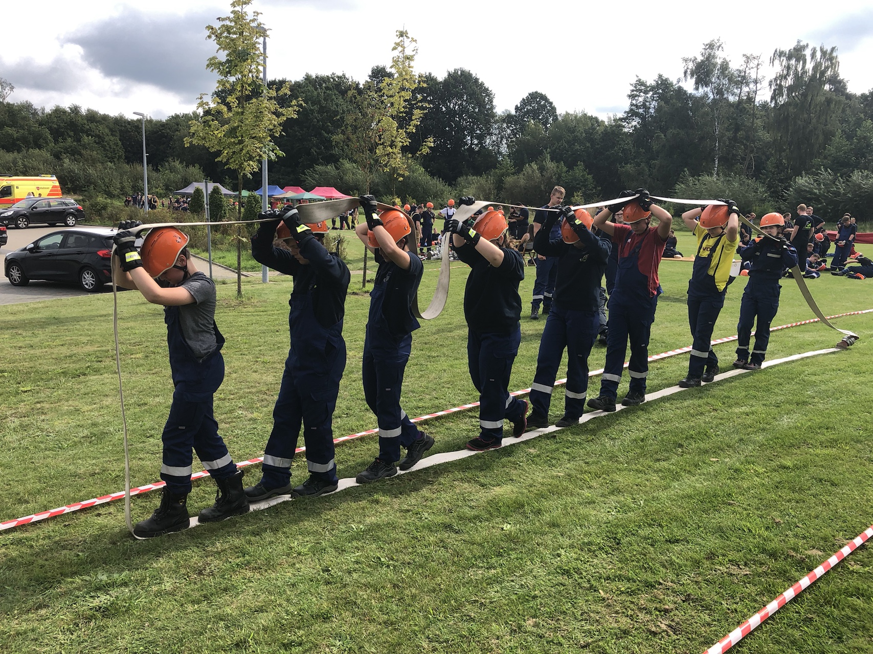 Sportlich gehört der Staffellauf zum Wettbewerb. Eine zeitliche Herausforderung mit verschiedenen Aufgaben, wie Schlauch aufrollen, Knoten, Dienstkleidung anziehen, Ziel werfen und über ein Laufbrett laufen gehören dazu.
